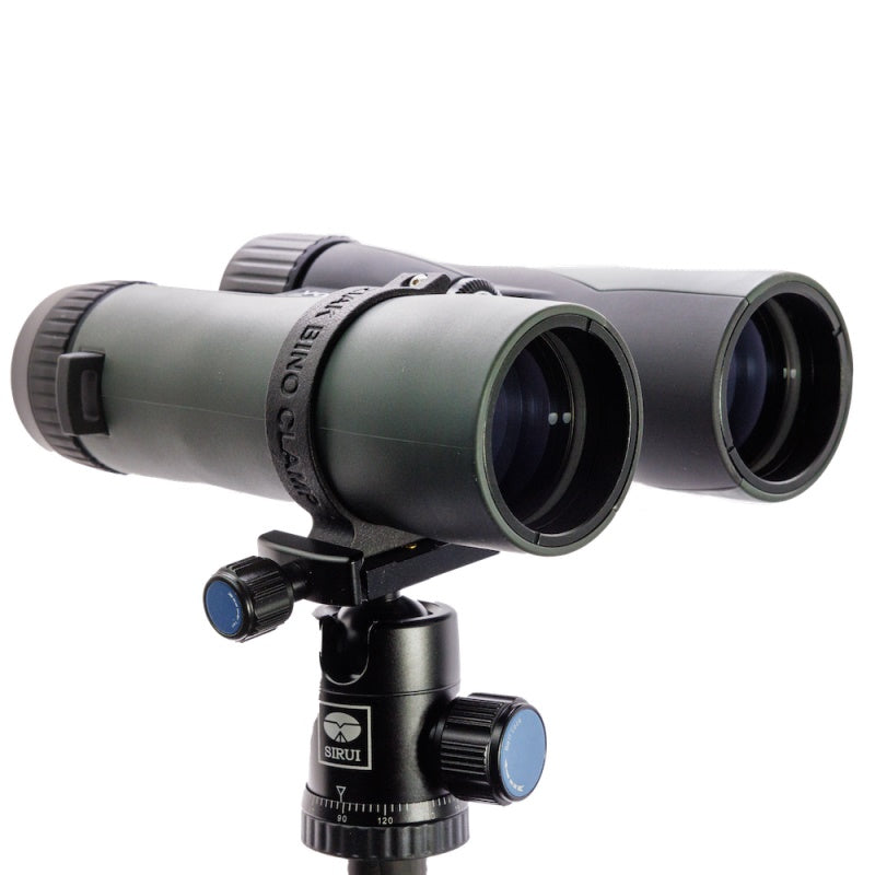 The Aziak Equipment Bino Clamp is the lightest, lowest profile, and most effective way to mount your binoculars to a tripod. Simply install the bino clamp onto your binoculars and you have a Arca-swiss compatible dovetail or 1/4-20 threads for any quick release plate to be mounted onto.