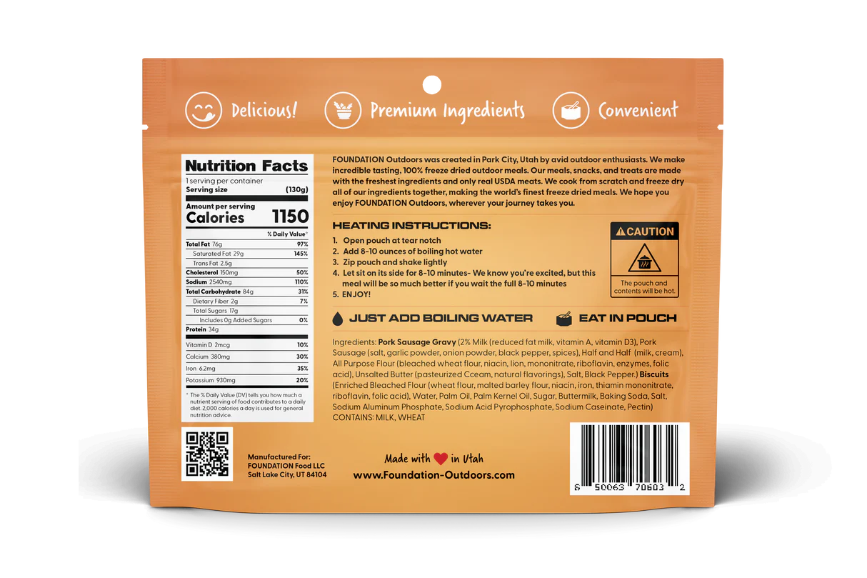 FOUNDATION Outdoors Biscuits & Sausage Gravy Freeze Dried Meal is the ultimate comfort food. It may be cold outside but your spirit will be lifted by the creamy texture, inviting aroma, and rich taste of traditional Biscuits & Gravy. We replicated this classic Southern dish by incorporating plenty of seasoned pork sausage, along with our buttery homemade biscuits that have just the right amount of crunch topped off with a hearty, creamy sausage gravy. FOUNDATION Outdoors Biscuits & Sausage Gravy Freeze Dried Meal is a great start to any journey. Enjoy this classic at the crack of dawn or at the end of a long outing. Either way, you will have the satisfaction and nutrition you need to keep you going.
